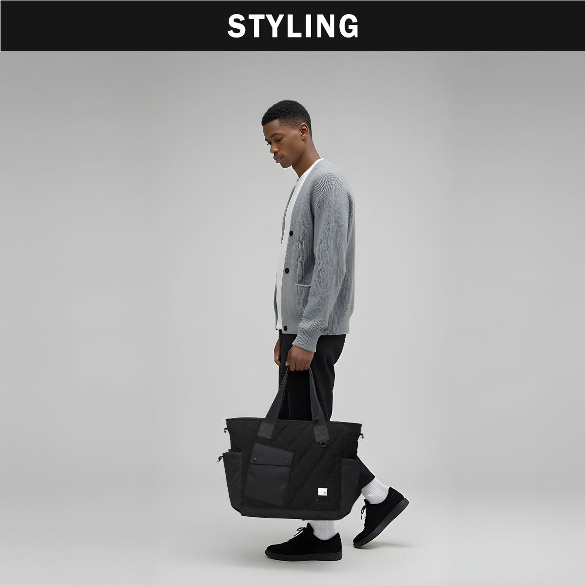 斜めに取り付けられたフラップ式のティルトポケットが特徴的な2WAYトートバッグ。内装にはLAPTOPを収納できるポケットを設けており、両サイドにもドローコード式のポケットを設けることで傘やペットボトルの収納が可能な、機能性に富んだ仕様。