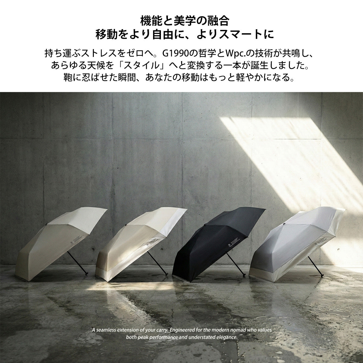 様々な世代・ジャンルの人々に“傘を持つことへの美意識”を発信し続ける『Wpc.』とG1990がコラボした折りたたみ傘。超軽量設計でポケットにも収まるコンパクトさが魅力。遮光率・UVカット率100%、UPF50+の完全遮光に加え、遮熱・撥水・耐水性も兼備。晴雨兼用で日常から旅行まで活躍します。